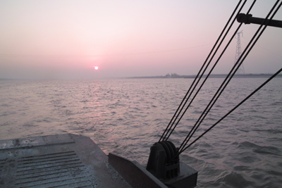 12月17日。烏林から赤壁へ向かうフェリーから長江へ沈む落日を撮った。この時、愛用の二コンF3PHPが300ミリを付けたまま鉄の甲板へ落下して動かなくなってしまった。