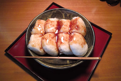 まんじゅうの語源は、三国志の英雄・諸葛孔明まで行き着くのだからおもしろい。孔明の「南蛮遠征」の帰途、長江の支流の濾水を渡れず困っていた時に、古来、49人の人頭を刎ねて河に献ずれば風浪は納まるという風習を聞き、羊豚の肉を麺に包み、人頭のごとく河に献じるとみごとに風浪は納まり無事河を渡れたという。それを名付けて「饅頭」と呼び慣わしたという。そのまんじゅうに甘い味噌ダレを付けて焼いた、上州焼きまんじゅうの起源は幕末(19世紀中期)頃といわれている。老舗の焼きまんじゅう屋の資料によれば、前橋の店が1857年、沼田の店が1825年に創めたとなっている。しかし歴史の文献などをみると戦国時代にもすでに上州の武士たちが、この焼きまんじゅうを食していたという記録もある。結婚式でも、お葬式でも、田植え、稲刈りを終えたあとなどにも必ず、煮ぼうとう、お切り込み、うどん、まんじゅうなど粉食品が出された。僕が運動会で一等になった時にも、県の写真コンテストで入賞した時にも本家のおばさんは、うどんを打って「けんちゃんがんばったね」と言って届けてくれたものである。いわば上州人にとっては、忘れることのできない”郷土食”なのであろう。
